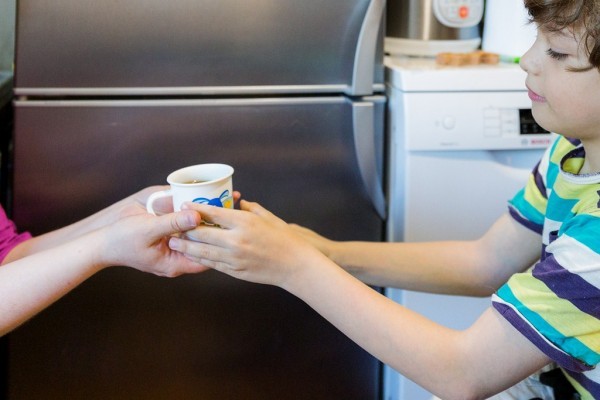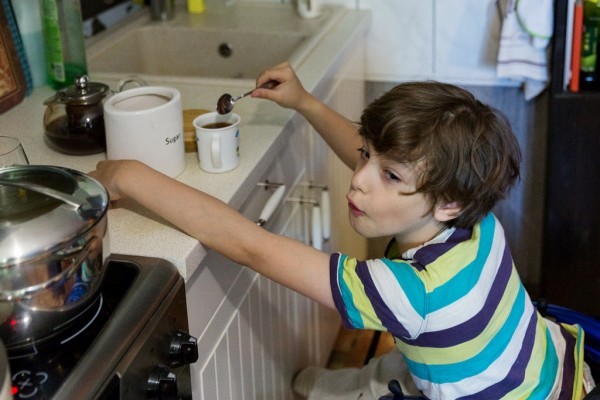 Пока же мальчик много лепит и рисует, но при нас «совсем окончательно» решил стать поваром. Даже сам сервировал чай. Правда, кипяток в чашку наливала всё-таки мама – с коляски до плиты не дотянуться.