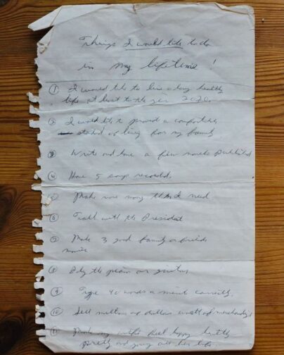 Список назывался «Что я хотел бы сделать в своей жизни!» Задания варьировались от относительно простых, таких как «переплыть через реку» и «вырастить арбуз», до более сложных — «переписываться с Папой Римским» и «быть приглашенным на политический съезд».