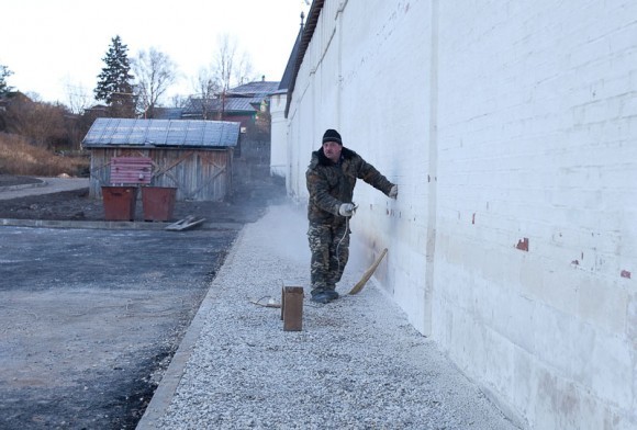 Внешний вид со стороны северо-запада на стены и башню монастыря. Реставрационные работы продолжаются