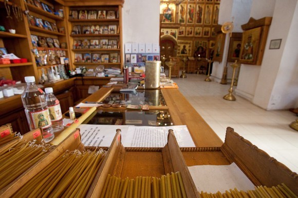 Наместник монастыря игумен Димитрий живо интересуется делами у свечницы