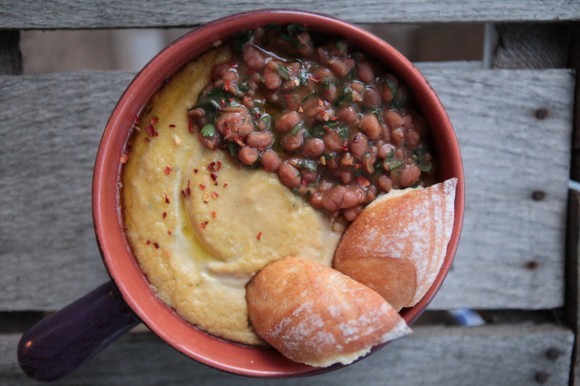 3. Возьмите небольшой стальной или керамический лоток для запекания, смажьте оливковым маслом и выложите ровным слоем хумус. Сверху полейте оливковым маслом. Отправьте в духовку на 15 минут. При подаче посыпьте поджаренными кедровыми орешками или выложите сверху теплую консервированную фасоль в томатном соусе.