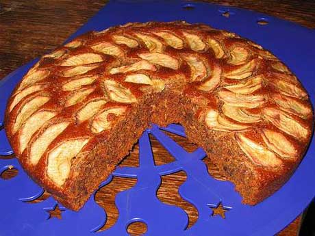 1 стакан сахарного песка, 1 стакан воды, 2 ст ложки мёда, 1 ч ложка соды, 0,5 ч ложки разрыхлителя, 0,5 стакана измельчённых орехов, 0,5 стакана растительного масла, 1,5-2 стакана муки, щепотка корицы, примерно 3 небольших яблока.