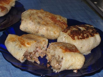 На каждый блин положить по 1,5-2 ст. л. начинки. Свернуть блины конвертиками. Разогреть в сковороде растительное масло. Выкладывать по 4-5 блинчиков гладкой стороной вверх и жарить 1,5 мин., затем перевернуть и жарить еще 1,5 мин.