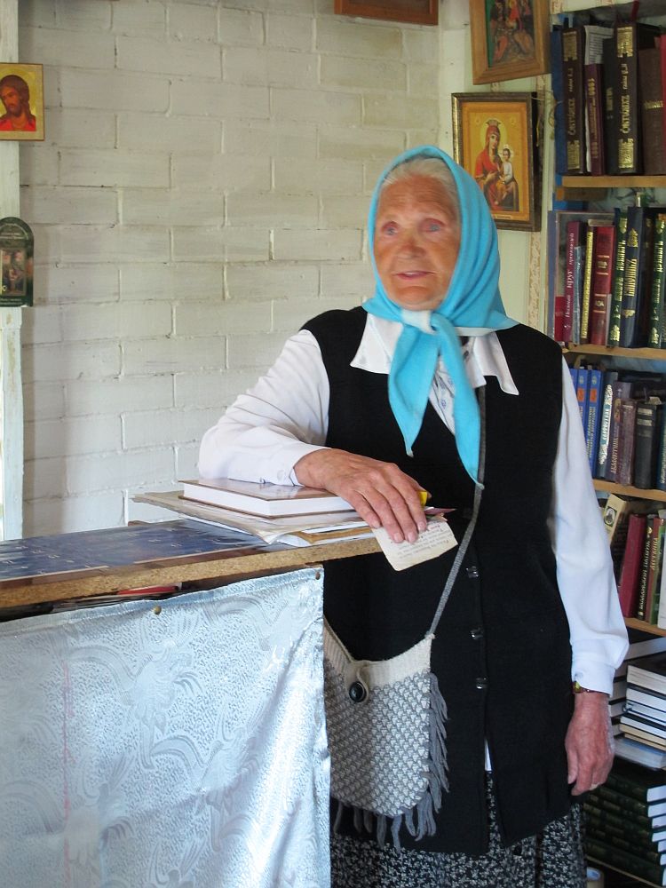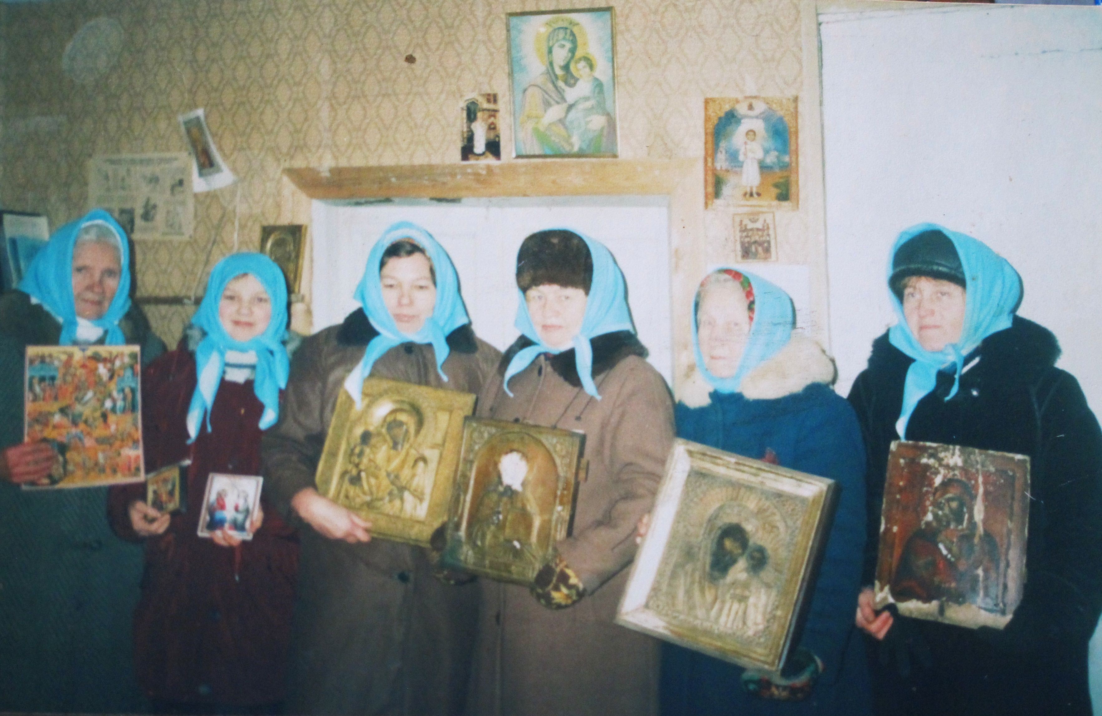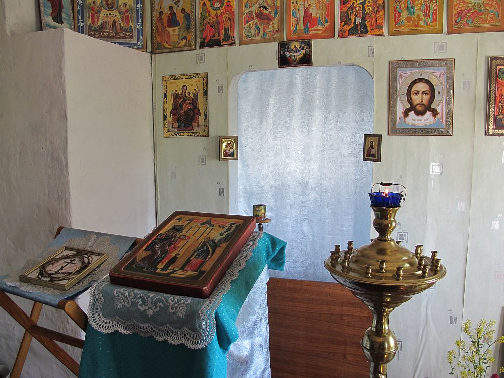 Среди святынь молитвенного дома соседствуют старинные иконы, принесенные разными людьми, и освященные вырезки из православных календарей. Матушка показывает на бумажных иконах разводы под стеклом: говорит, что они мироточили, а почерневшие старинные иконы обновились (стали отчетливее и ярче).
