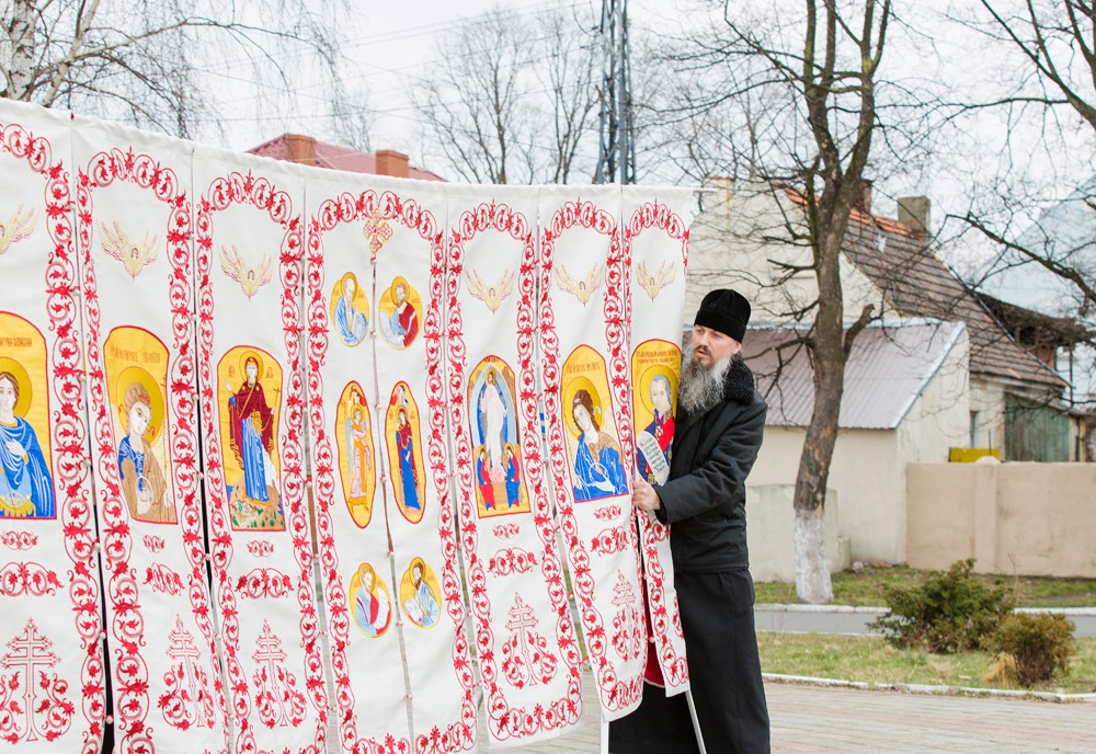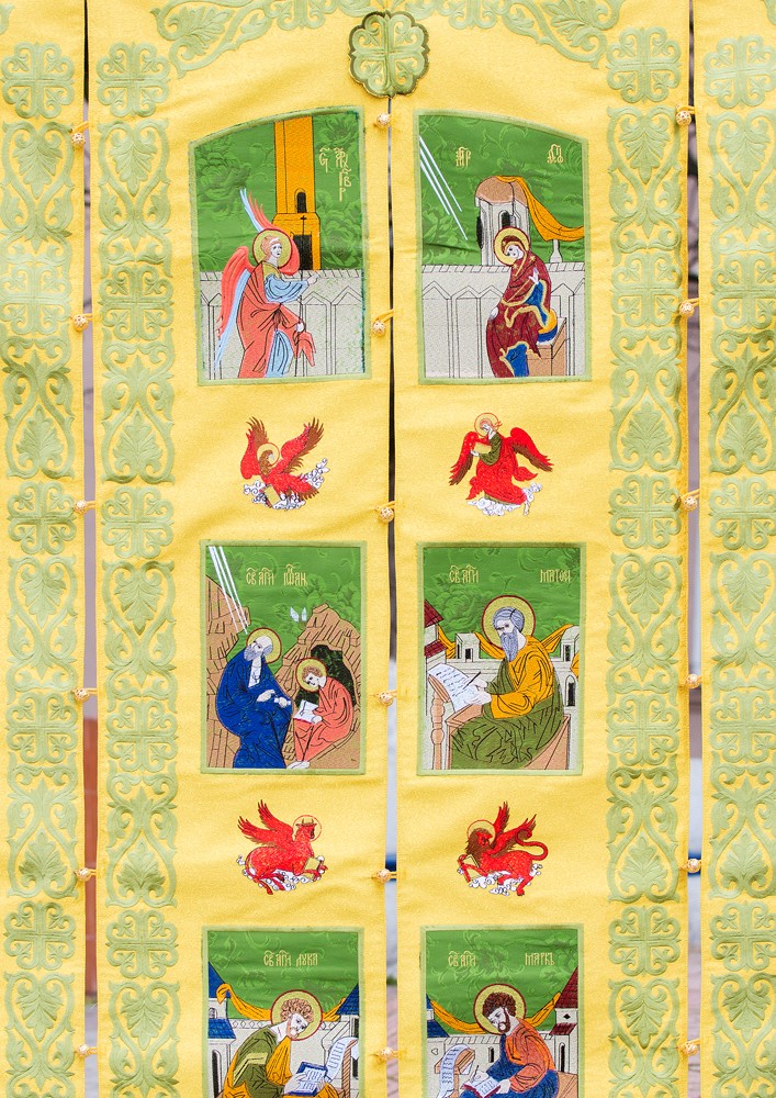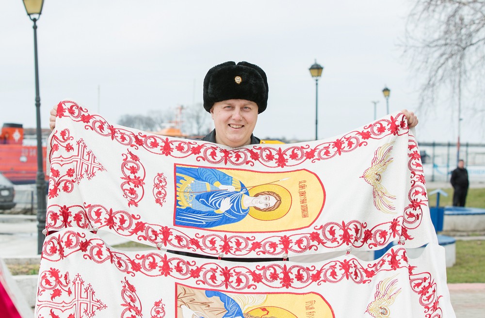 Иконостасы, готовые к освящению сейчас, – тканевые с вышитыми иконами, аккуратно сворачиваются в сумки и складируются. «Это особенно хорошо для подводных лодок – там свободного места ни на один метр не найдешь. А сейчас с большой благодарностью подводники у нас просят такие иконостасы», – говорит вице-адмирал Бражник.