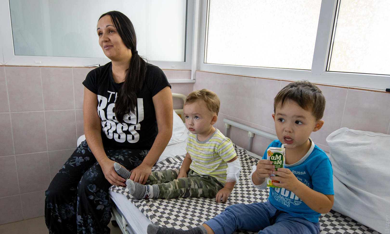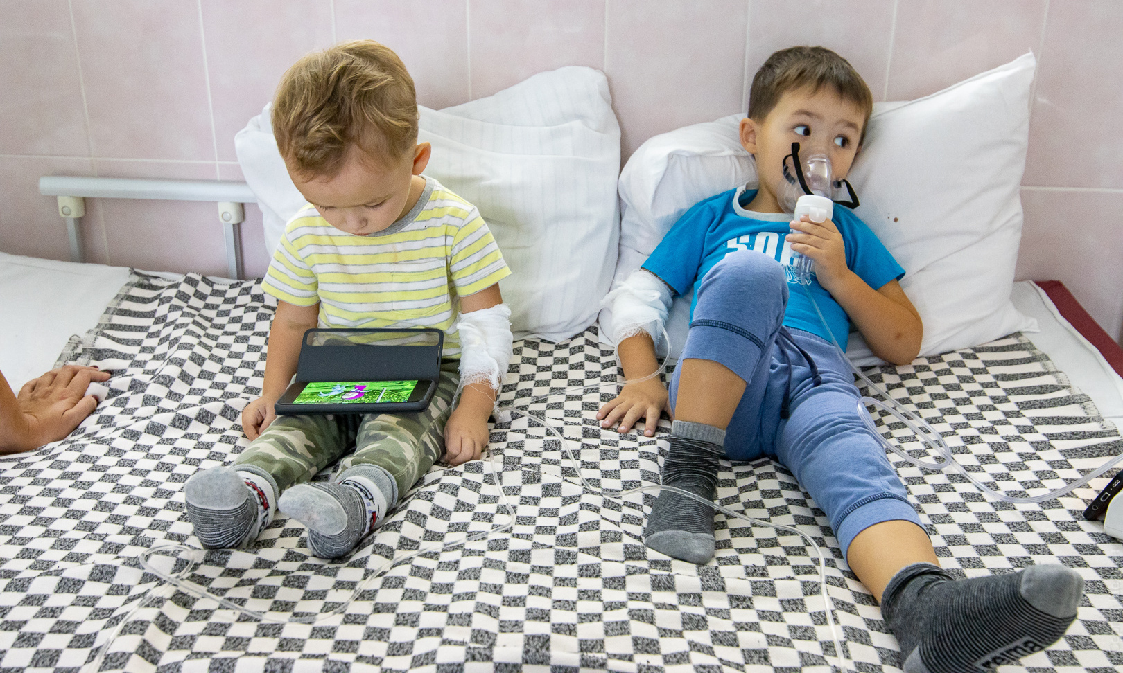 Белый бокс. В нем две белые взрослые кровати и две детские кроватки с высокими бортиками. Белые стойки для капельниц, столик с ингалятором, окно во двор и окно в коридор… Саша (1,9 года) и Петр (3 года) сидят вместе с мамой на кровати. Их правые ручки у локтя перехвачены бинтами.