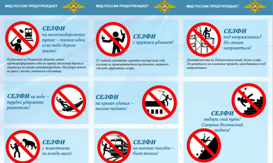 Созданная министерством памятка призвана обратить внимание, в первую очередь молодежи, на данную проблему. «Мы попытались наглядно, в виде пиктограмм, изобразить наиболее травмоопасные случаи создания селфи, тем самым предостеречь граждан от неоправданного риска ради запоминающегося кадра», — уточняют в МВД.