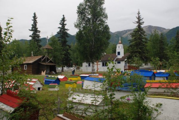 На Аляске рядом с одним из храмов мы видели маленькие разноцветные домики размером с улей, они напоминали игрушечный городок, но оказалось, что так выглядят местные могилы, а точнее гробы-домовины – отголосок языческой веры.