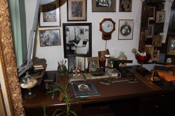 Отец Петр показал нам кабинет владыки, в котором ничего не менялось со времен жизни святого. Над деревянным столом висели фотографии, небольшие иллюстрации и иконы, все так же лежали личные вещи святителя Иоанна, его книги, исписанные пожелтевшие листы бумаги и открытая чернильница.