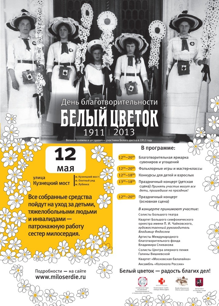 Ежегодно уже три года устраивая в Москве праздник благотворительноти «Белый цветок», православная служба помощи «Милосердие» возрождает традиции дореволюционной благотворительности. В 1911 – 1914 годах дни Белого цветка проходили при непосредственном участии императрицы Александры Федоровны и членов царской семьи. Средства, собранные на празднике, тогда направлялись в пользу туберкулезных больных.