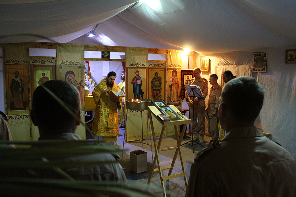 Фото: pobeda.ruПо благословению Патриарха Кирилла на сирийской авиабазе Хмеймим, где базируется авиационная группа ВВС России, был совершен чин освящения часовни во имя святого великомученика Георгия Победоносца. Для часовни передана икона с частицей мощей святого. В богослужении участвовало более 500 военнослужащих, каждому была вручена икона великомученика Георгия. Также представители Церкви обсудили с командованием группировки вопросы организации работы штатного военного духовенства с верующими военнослужащими. Состоялись встречи с личным составом военных кораблей Черноморского флота «Пытливый» и Балтийского флота «Ярослав Мудрый» в г. Тартус.