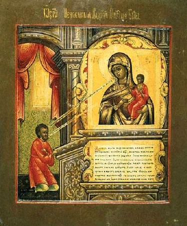 Икона Божией Матери, именуемая «Нечаянная Радость», пишется так: в комнате, вверху икона Божией Матери, а внизу около нее коленопреклоненно молящийся юноша. Предание об исцелении некоего юноши от плотской страсти через эту святую икону описано в книге святителя Димитрия Ростовского «Руно Орошенное». Юноша молился по привычке перед образом Пречистой и вдруг увидел, что изображение ожило, язвы Господа Иисуса раскрылись и кровоточат. В страхе он воскликнул: «О Госпожа, кто это сделал?» На что Богородица отвечала: «Ты и прочие грешники грехами своими вновь распинаете Сына Моего». Тогда только раскрылась перед ним бездна его грехопадения, долго молил он в слезах Богородицу и Спасителя о помиловании. Наконец, была дана ему нечаянная им уже радость прощения и оставления грехов.