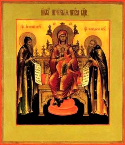 Свенская-Печерская икона Божией Матери была написана преподобным Алипием Печерским († около 1114, память 17 августа). На иконе изображена Божия Матерь, сидящая на престоле, на коленях у Нее Богомладенец. Справа от трона стоит преподобный Феодосий, а слева – преподобный Антоний Печерские. До 1288 года она находилась в Киево-Печерском монастыре, где прославилась чудесами, а затем была перенесена в Брянский Свенский монастырь в честь Успения Пресвятой Богородицы. Произошло это следующим образом. Черниговский князь Роман Михайлович, будучи в Брянске, ослеп. Услышав о чудесах от иконы, писанной самим преподобным Алипием, князь послал в монастырь гонца с просьбой прислать к нему в Брянск икону для исцеления. Икону отправили вместе со священником по реке Десне. Во время плавания лодка пристала к правому берегу реки Свены. После ночевки путники утром пошли к лодке, чтобы помолиться иконе, но не нашли ее там, а увидели на горе против реки Свены. Икона стояла на дубе между ветвями. Весть об этом дошла до князя Романа; его привели к иконе пешком. Князь горячо молился и обещал построить на этом месте монастырь, отдав ему все земли, которые увидит с горы. После молитвы князь начал прозревать. Сначала он увидел тропинку, затем близкие предметы и, наконец, все окрестности. Приложившись к иконе, князь отслужил молебен, а затем все собравшиеся основали деревянный храм в честь Успения Пресвятой Богородицы. Дерево, на котором пребывала икона, срубили и употребили на доски для других икон. Тогда же было установлено празднество Свенской иконе Божией Матери 3 мая.