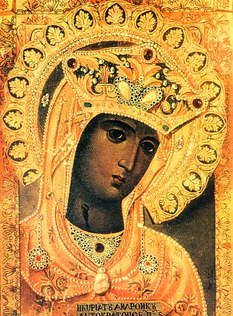 Андрониковская икона Божией Матери, известная также под именами Монемвасийской и Греческой, – родовая святыня греческого императора Андроника III Палеолога, по преданию, одна из написанных апостолом и евангелистом Лукой. По первому сохранившемуся документальному свидетельству об иконе, в 1347 году Андроник пожертвовал ее Монемвасийской обители в Морее, где она пребывала до начала XIX-го столетия. После нападения на Грецию в 1821 году турецких войск, настоятель монастыря, епископ Агапий, пытаясь спасти чудотворную Андрониковскую икону, скрылся с нею в г. Патрас. Перед смертью Агапий завещал эту святыню своему родственнику, русскому генеральному консулу Н. И. Влассопуло, сын которого, А. Н. Влассопуло, в 1839 году переслал икону из Афин в Одессу с письмом на Высочайшее имя для препровождения ее в Петербург императору Николаю Павловичу. С 1839 по 12 мая 1868 года Андрониковская икона находилась в Зимнем дворце, а с 12 мая 1868 года по 16 апреля 1877 г. – в Троицком соборе, что на Петербургской стороне. В 1877 году чудотворная икона была перенесена в Казанский женский монастырь близ города Вышний Волочок Тверской епархии. В 1984 г. икона была украдена и нынешнее ее местонахождение неизвестно.