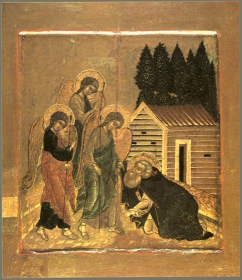 Семь лет жил Амос в монастыре как послушник, ведя суровую жизнь. Дни проводил он в трудах, ночи – в бдении и молитве. Иногда обнаженный до пояса, весь покрытый комарами и мошками, молился в лесу до утреннего пения птиц.