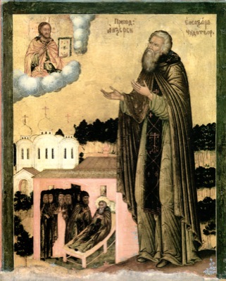 Преподобный Елеазар Анзерский родился в городе Козельске в семье купцов Севрюкиных. По благословению родителей, он удалился в Соловецкий монастырь, где принял постриг от игумена преподобного Иринарха († 1628; память 17 июля). В монастыре открылось его удивительное художественное дарование: он обучился резьбе по дереву и участвовал в украшении Преображенского собора. По благословению игумена, он удалился на Анзерский остров, где стал отшельником и постоянно пребывал в молитве и Богомыслии. Чтобы добыть себе пропитание на пустынном острове, преподобный Елеазар вырезал деревянные чашки, которые оставлял на пристани. Проплывавшие мимо острова забирали чашки, а взамен оставляли припасы.