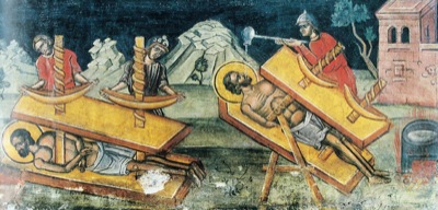 Первым пострадал святой Иона. Мученика привязали к дереву и долго избивали, потом волочили по льду замерзшего озера, отрезали пальцы на руках и ногах, отрезали язык, содрали кожу с головы, наконец, перепилили пополам и бросили тело в ров.