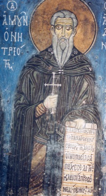 Преподобный Аммон Египетский был воспитан в христианском благочестии. Вступив в брак по воле родных, Аммон по согласию с супругой сохранил девство и стал жить с ней как брат с сестрой. 20 лет духовные супруги подвизались в посте, молитве и совместных трудах. Возмужав в благочестии, супруги порознь продолжили свои подвиги. Жена Аммона осталась дома и учредила в нем женский монастырь. Аммон ушел в Нитрийскую пустыню, где пребывал 22 года и достиг высоких духовных совершенств, дара чудотворения и прозорливости.