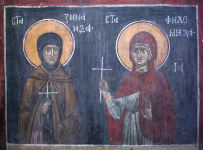 Мученицы Зинаида и Филонилла, родственницы святого апостола Павла, были родом из Тарса. Святые оставили свой дом и поселились в пещере близ города Димитриады и жили там в непрестанных молитвах и трудах. Они владели врачебным искусством и охотно лечили всех, кто обращался к ним за помощью, исцеляя их души обращением к Истинному Богу. За святую ревность о Господе проповедницы приняли мученический венец: идолопоклонники побили их камнями.