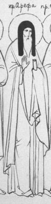 Преподобный Арефа был родом из Полоцка. Проживая в монастыре, он хранил в своей келлии много богатства. Однажды воры обокрали его. Жалея о потерянном имуществе, преподобный Арефа стал роптать на Господа, за что был поражен тяжкой болезнью. Будучи при смерти, он видел, как пришли к нему Ангелы и бесы и начали спорить между собою. Бесы заявляли, что за скупость и ропот на Бога он должен быть предан им, Ангелы же, обратясь к нему, молвили: «Несчастный человек, если бы ты возблагодарил Бога за украденное имущество, это вменилось бы тебе в милостыню». После видения преподобный Арефа был возвращен к жизни. Последние дни свои он провел в затворе, в сокрушении и раскаянии о грехах, отрекшись от всего земного. Скончался святой Арефа не позже 1190 года. По Иконописному Подлиннику преподобный изображается так: «Подобием надсед, брада подоле Козмины немного, ризы преподобнические». Преподобный Сисой, затворник, в общей службе преподобным Антониевых пещер называется «просиявшим в посте». Преподобный Феофил в этой же службе именуется как «в чудесех изящный».