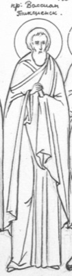 Преподобный Вассиан Тиксненский (Тотемский), в миру Василий, крестьянин села Стрелицы (по другим данным, деревни Бурцево), близ города Тотьмы, занимался портняжным ремеслом. Оставив семью, он принял постриг от преподобного Феодосия Тотемского в Суморинской обители на реке Сухоне, где прожил несколько лет в трудах и послушании. В 1594 году преподобный поселился недалеко от Тотьмы, при храме во имя святителя Николая Чудотворца, на реке Тиксне. Вначале он жил на церковной паперти, а затем поставил около храма келлию. Преподобный посещал каждое Богослужение. Тринадцать лет он носил на теле вериги: на плечах тяжелую цепь, на чреслах железный обруч, а на голове, под куколем, железную шапку. Стремясь к уединению, преподобный, кроме духовного отца, никого не принимал в своей келлии. Питался он подаянием, которое ему клали на оконце. Преставился преподобный Вассиан 12 сентября 1624 года. Только при погребении обнаружилось, как тяжко смирял он свою плоть.