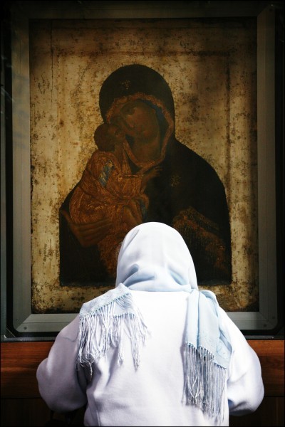 Старый тихий храм в небольшом подмосковном городке. Сумрачные «фрески» — осыпающиеся серо-зелено-бурые картины по мотивам евангельских сюжетов — на стенах. Огромная, в человеческий рост, Смоленская икона Божией Матери, стоящая почему-то прямо на полу в углу за баками со святой водой. Баки сияют нержавейкой, и икона от этого выглядит как-то особенно скромно и незаметно, несмотря на свои размеры и латунный, начищенный к празднику оклад. Тут же рядом — Распятие.