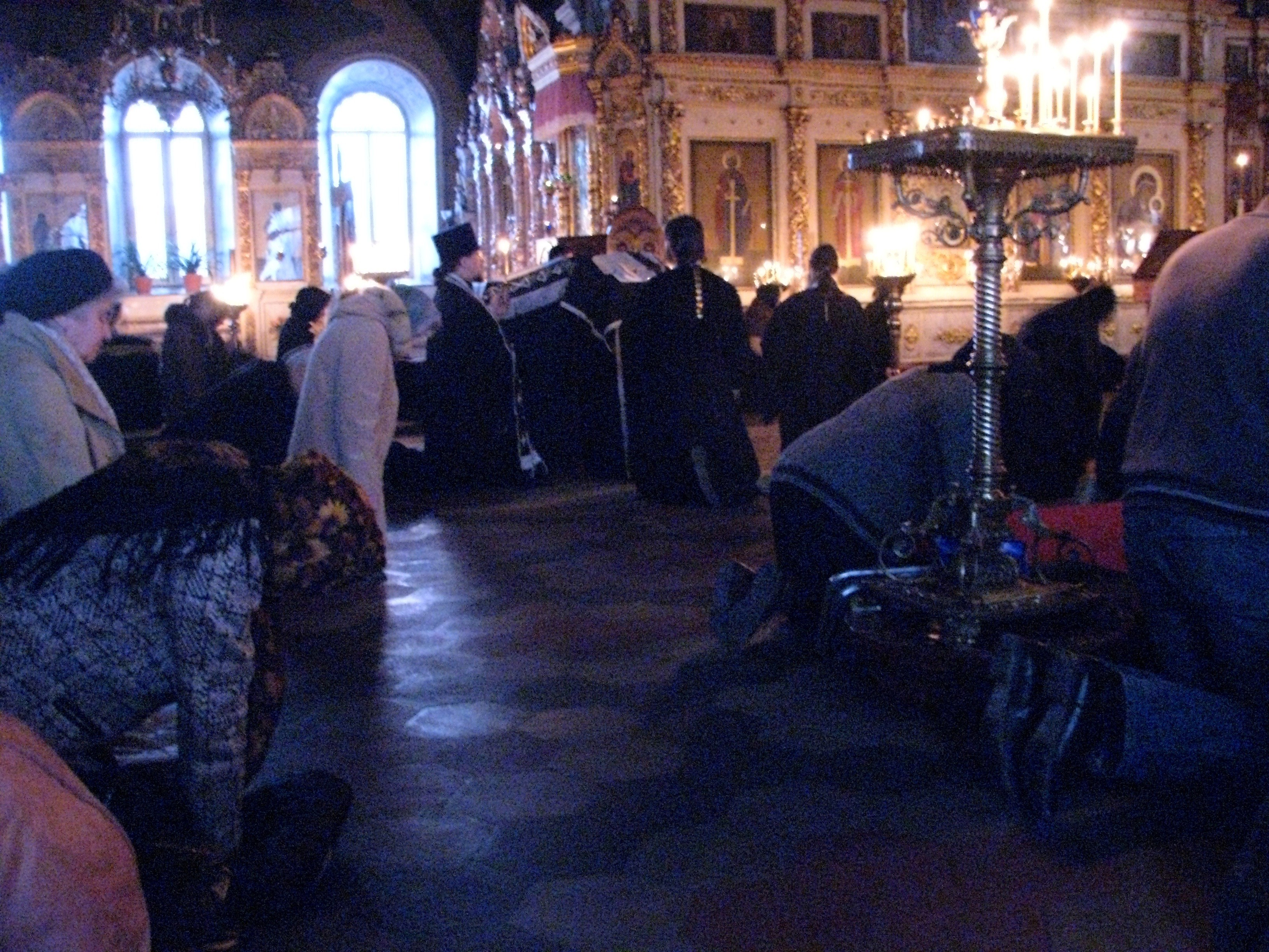 Еще светит яркое весеннее солнце, а в храме уже сумерки обнимают стоящий на коленях народ. Стоит на коленях и сам Владыка в черной мантии с поникшей главой и с силой выдыхает слова Канона. Стоят на коленях и простые священники, вздыхая, глядят в землю. И есть от чего: уже не видны во мраке Царские врата — Врата Царства Небесного. Уже не видны во тьме лики святых угодников, и только редко на какой иконе едва блеснет золото риз, с тем, чтобы тут же погаснуть. Они словно отходят на ту сторону Стикса, а мы здесь, на этом берегу все глубже погружаемся во мрак и жуть одиночества. Уже и сами люди стали, словно темные плотные тени. Исчез цвет наших одежд, помертвел цвет лиц, погасли взоры. Только сердце еще живое, и оно тоскует безмерно.