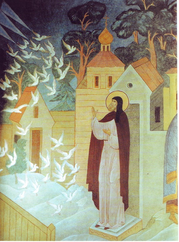 Господь показал преподобному Сергию в видении птиц множество его учеников. Роспись Серапионовой палаты