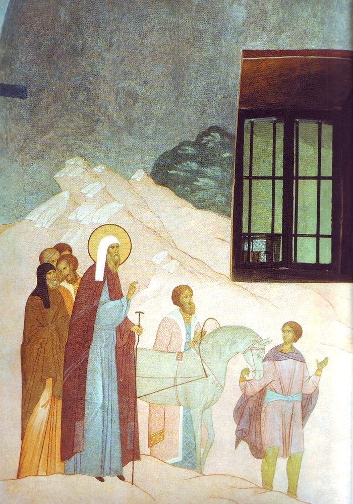 Преподобный Сергий Радонежский благословляет великого князя Московского Димитрия Донского на Куликовскую битву и предсказыает ему победу. Роспись Серапионовой палаты