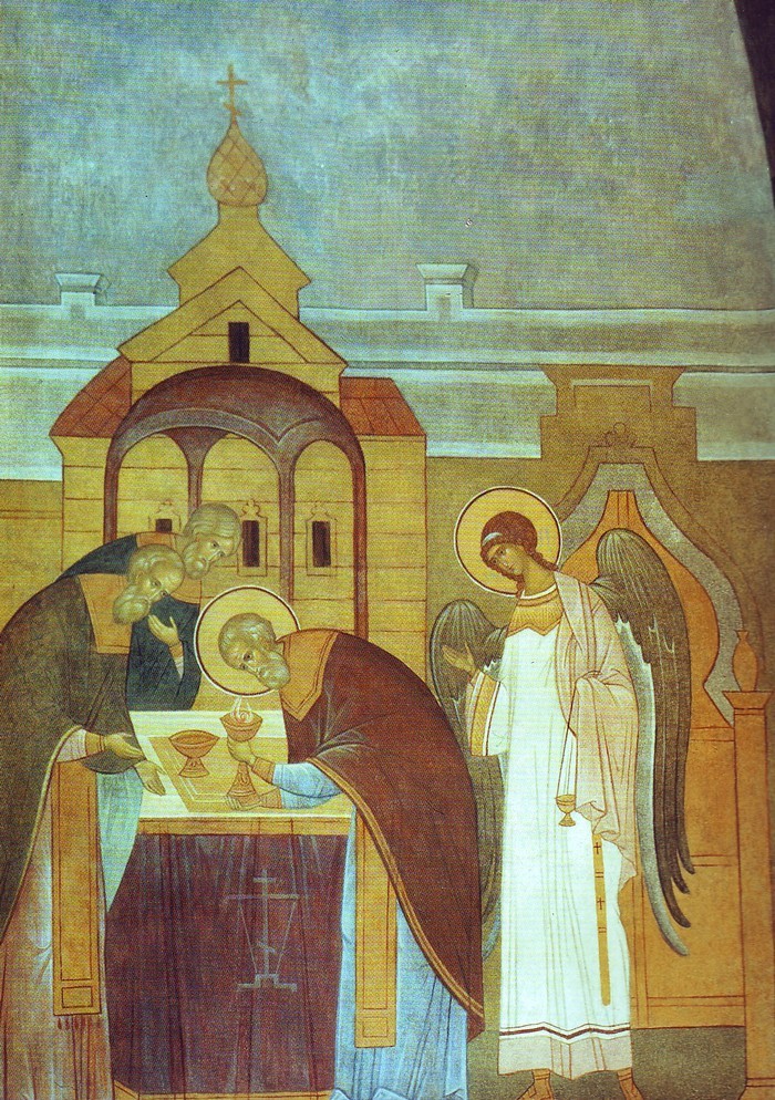 Прп. Сергий во время Божественной Литургии сподобился видимого сошествия Святого Духа в образе огня на Святые Дары и сослужения Ангела.