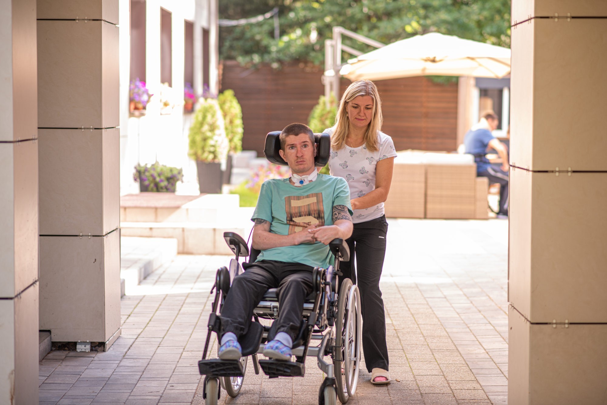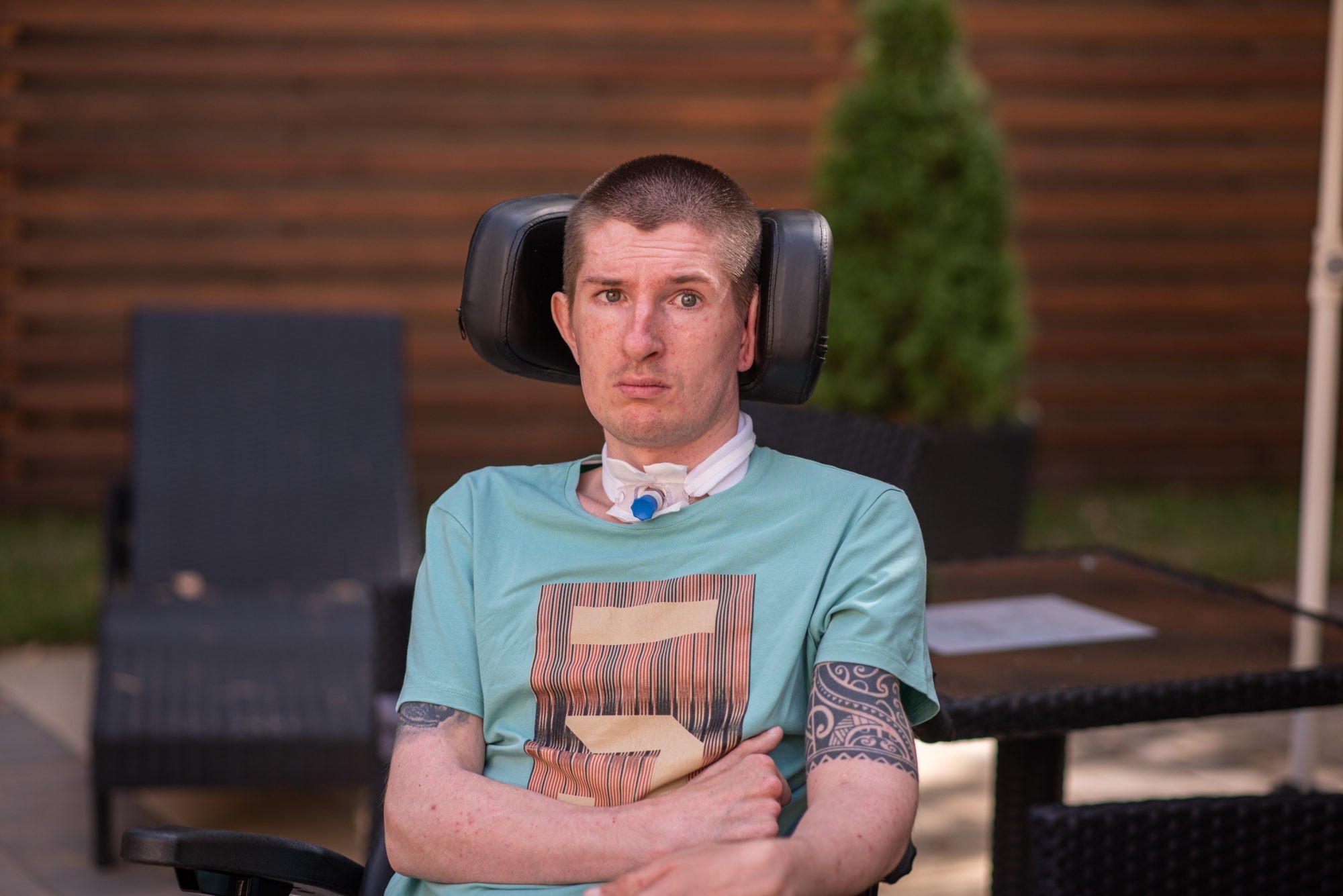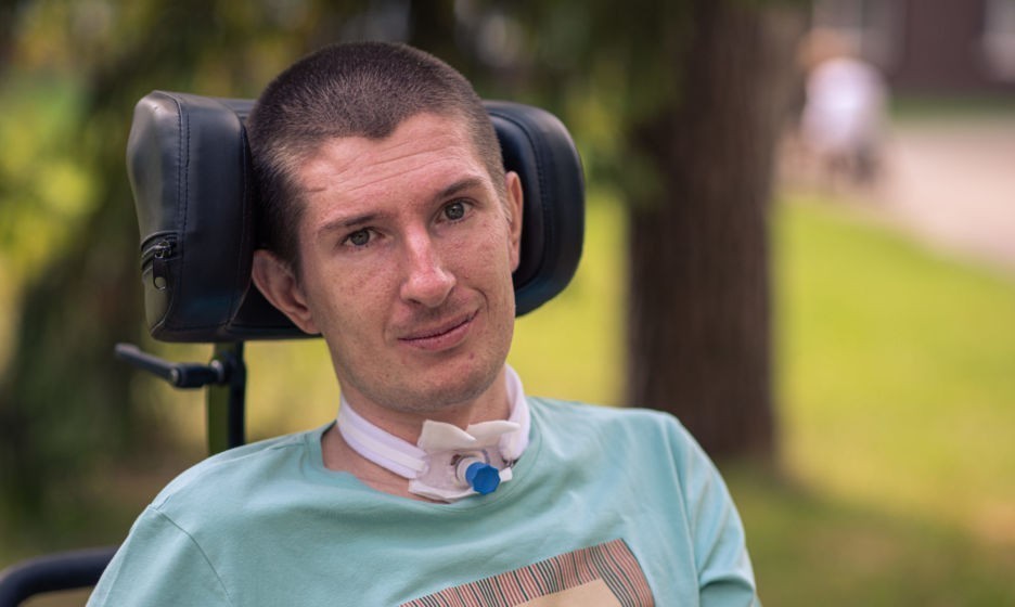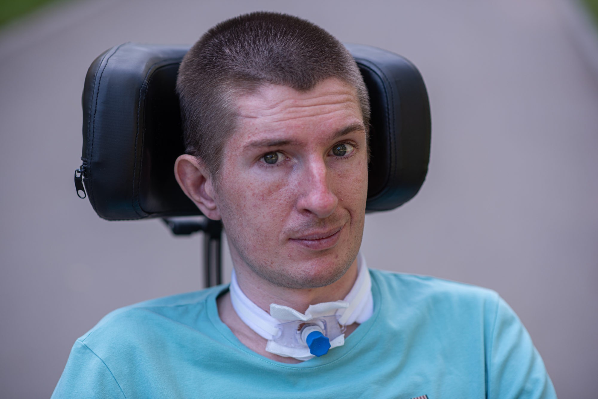 Два года назад Женя разбился на мотоцикле и стал инвалидом. Благодаря курсам реабилитации он начал не очень четко, но говорить, пытается самостоятельно есть, может удержать в правой руке небольшие предметы, написать стилусом что-то в мобильном телефоне. Но он до сих пор не может ходить, самостоятельно сесть в кровати. У него совсем не работает левая рука. В горле все еще стоит трахеостома (искусственное дыхательное горло). Курсы реабилитации нужно продолжать.