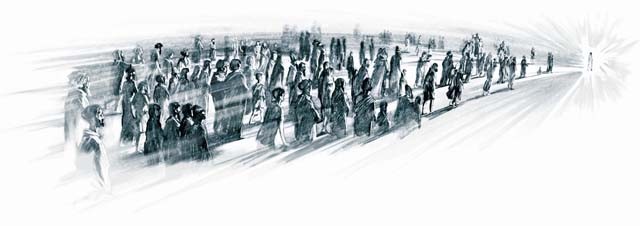 Человек в длинной белой одежде что-то говорит тем, кто идет рядом с ним. Говорит очень спокойно и негромко, но, похоже, все они прекрасно его слышат, потому что никто не пытается стать к нему ближе. Лица их тоже спокойны и мирны — как и у всех идущих людей.
