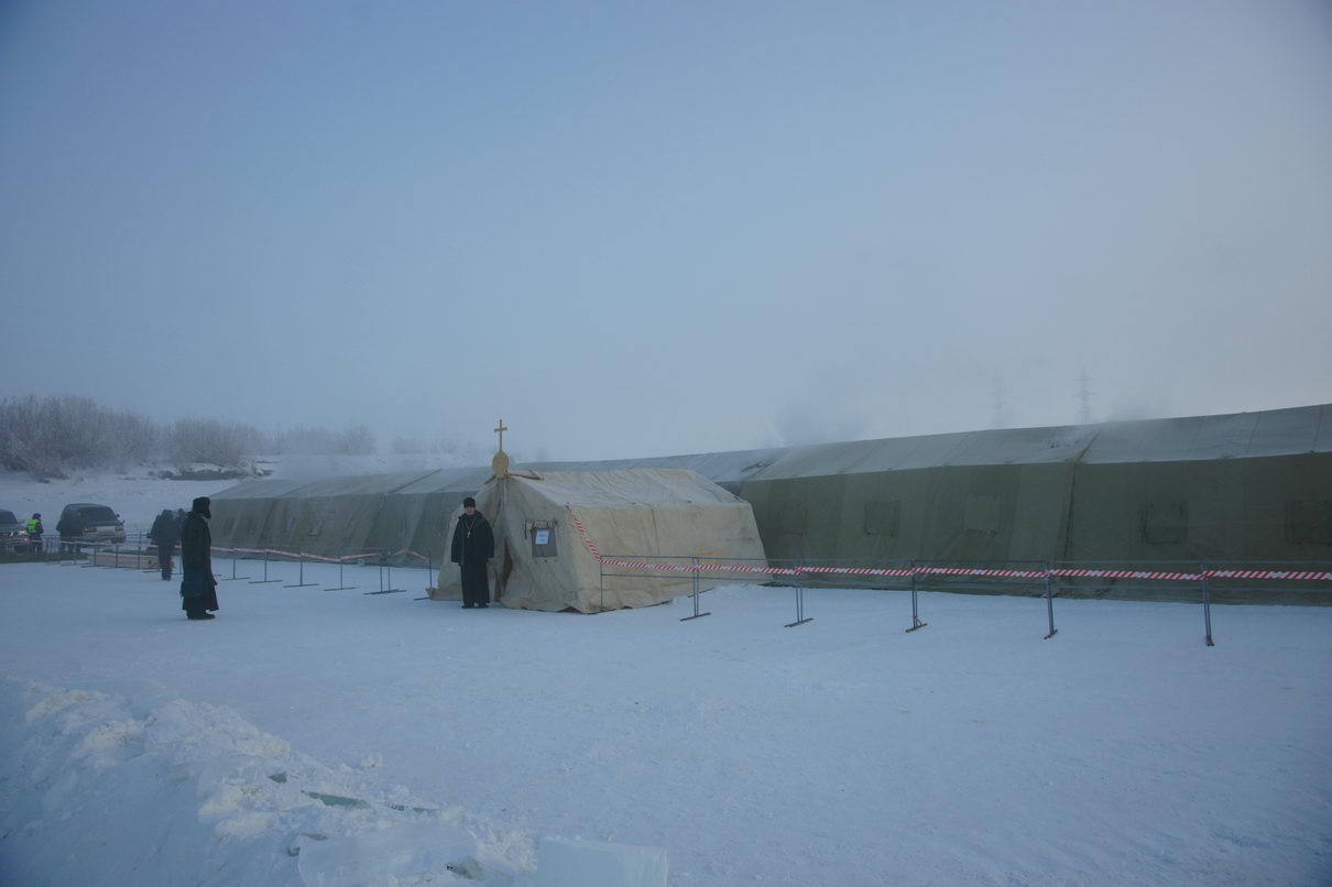 Подготовку столь серьезного и опасного мероприятия в Якутске и районах республики всегда берет на себя МЧС. Делаются замеры толщины льда, расчищается площадка, спецтехникой выпиливается крестообразная прорубь. Порой лед может достигать двухметровой толщины, а под ним еще 4 метра воды. Поэтому изготавливается специальная огромная металлическая люлька, которую обшивают досками и потом монтируют в лед для безопасности купающихся.