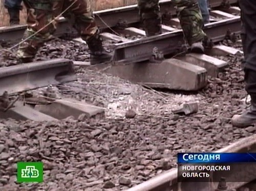 Взрыв опрокинул бы вагон, и он сразу бы отцепился от состава. Думаю, что версии повреждения рельс, вызванные какими-то иными причинами, необходимо рассматривать самым пристальным образом, так же как и теракт. На следующем снимке видно, что лопнул левый рельс, в то время как любой подрывник подложит заряд со стороны насыпи под правый рельс, чтобы не залезать на пути, где его видно издалека. На снимке видна арматура от разбитых шпал, лежащая горизонтально, в то время как взрыв задрал бы ее вверх.