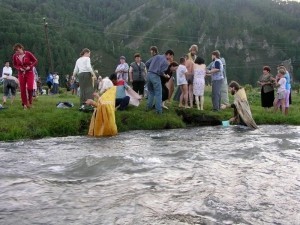 деятельность требует больших усилий. Приходится находить какие-то нестандартные выходы из разных положений. На Алтае один раз нас очень недружелюбно встретили, приняли за сектантов, чуть ли не побить хотели. В другой раз мы оказались в отдаленном алтайском селе, где раньше стоял храм, но потом сгорел. Священника здесь не видели уже много лет, и к нам отнеслись с недоверием. Мы назначили крестины в местном клубе, потому что другого здания не было. Повесили объявления, прошли по селу. На следующее утро мы обнаружили, что для крестин нам приготовили большую грязную бочку. И хотя желающих принять крещение оказалось всего два-три человека, крестить в бочке нам показалось неудобно. Мы, конечно, огорчились, но облачились в священнические облачения и решили совершать погружение в реке, которая была неподалеку. Двинулись к реке своеобразным крестным ходом: впереди священники, которые несут иконы и все что нужно для крещения, а за нами те, кто хочет креститься. И пока мы шли через деревню, этот хвост вырос примерно до 80 человек. На пологом берегу реки поставили иконы, прочитали чин, поговорили со всеми, произнесли проповедь, а потом священники спустились в реку и, стоя по пояс в воде, крестили весь этот народ.