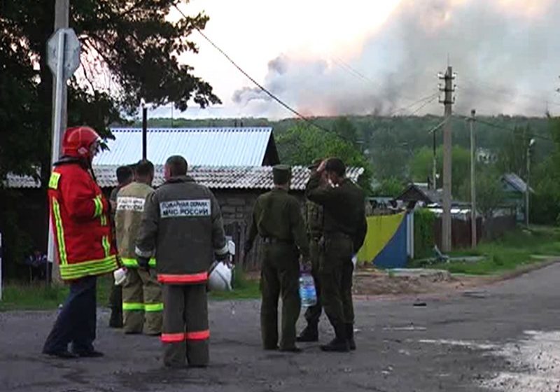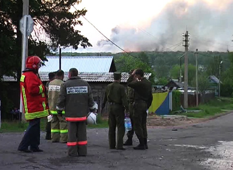 Источник ТАСС в силовых структурах сообщил, что загорелись две площадки по утилизации, в общей сложности на них находится около 25 000 боеприпасов. По данным другого собеседника агентства, разлет осколков от взрывающихся снарядов достигал 15 километров. Огонь уничтожил находившуюся на территории части пожарную технику. Взрывная волна выбила окна в жилых домах, осколки повредили машины военных. По данным Министерства обороны, личный состав склада эвакуирован.
