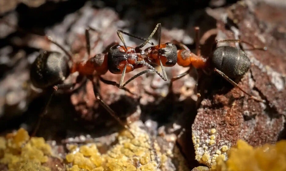 Муравьи общаются друг с другом на коре дерева в городском парке в Таллине, Эстония. Фото: Сергей Гриц/AP