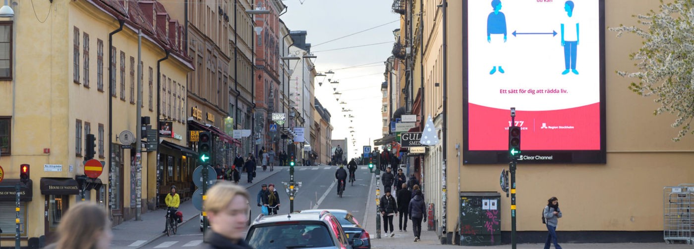 соблюдения социальной дистанции на фасаде дома в Стокгольме,