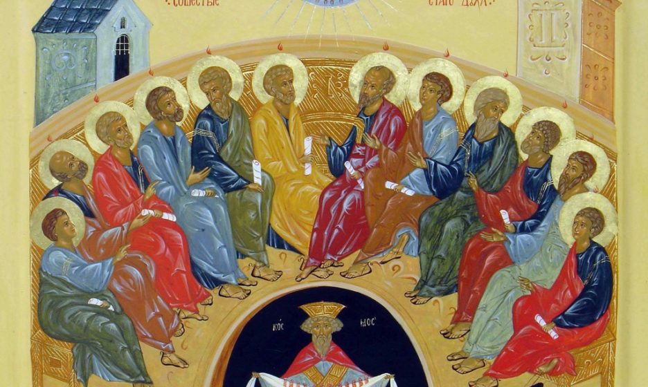 По второму вопросу: где совершилось сошествие Св. Духа? — в церковно-исторической науке существует два мнения. Повествование Деян. 2 о большом скоплении народа, вызванном чудом Пятидесятницы, и о речи Петра к народу, которая привела к крещению трех тысяч, естественно наводит на мысль, что сошествие Св. Духа совершилось где-то под открытым небом, может быть в одном из храмовых дворов. Однако, начиная с древнейшей эпохи, в Церкви преобладало мнение, что Дух Святой сошел на Апостолов в «Сионской Горнице». Как уже указывалось, выразители этого мнения, что здесь в горнице, где Господь совершил последнюю вечерю с учениками произошло и чудо Пятидесятницы. Если, как мы старались показать, Дух Святой сошел на Апостолов, с которыми могли находиться несколько близких им лиц, предание о Сионской Горнице не представляет трудностей. Защитниками этого мнения, которое и в наше время разделяется большинством толкователей, часто высказывается мысль, что привлеченная чудом толпа могла собраться на улицах города по близости от того дома, где находились Апостолы. Нельзя не признать, однако, что внутри храмовой ограды, ап. Петр мог легче быть услышан громадной толпой, чем в узких улицах старого восточного города.
