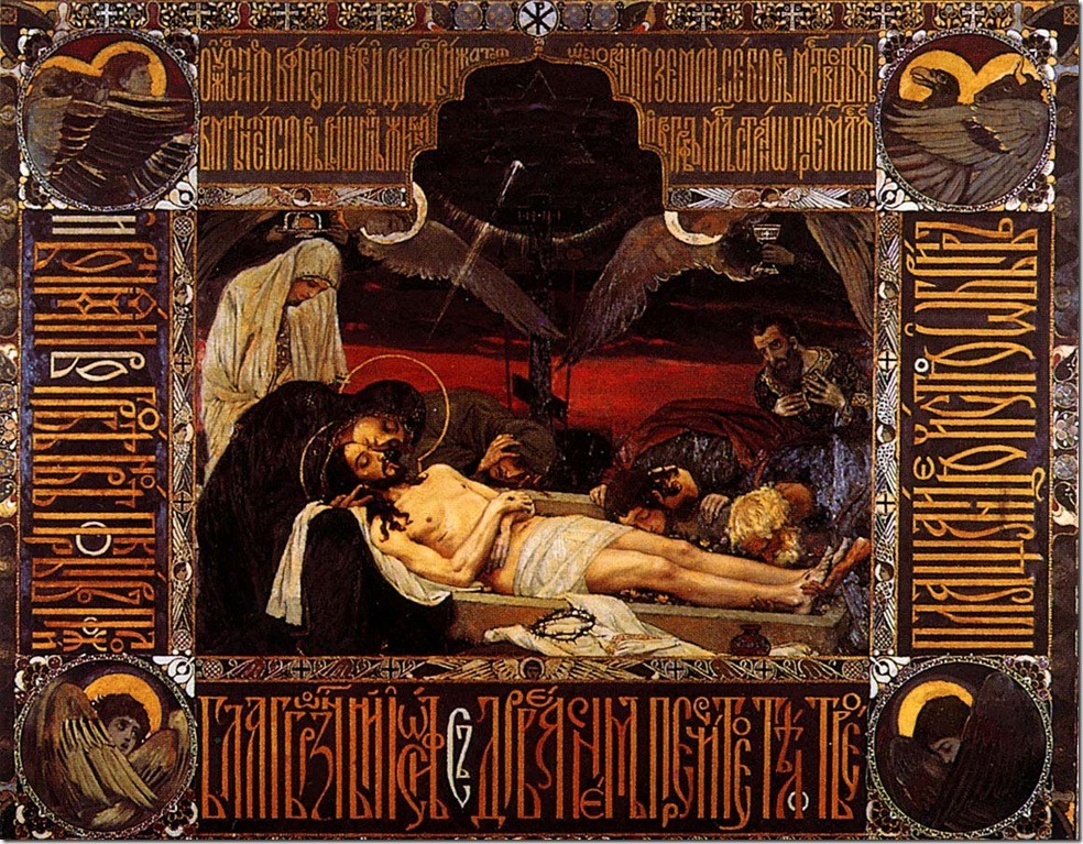 Вкусив уксуса, Спаситель сказал: «Совершилось», то есть исполнилось обетование Божие, совершено спасение человеческого рода. После этого Он громким голосом произнес: «Отче! в руки Твои предаю дух Мой». И, преклонив главу, предал дух, т. е. умер. И вот, завеса в храме, закрывавшая святое святых, разодралась надвое, с верхнего края до нижнего, и земля потряслась, и камни расселись; и гробы отверзлись; и многие тела усопших святых воскресли, и, вышедши из гробов по воскрешении Его вошли в Иерусалим и явились многим.