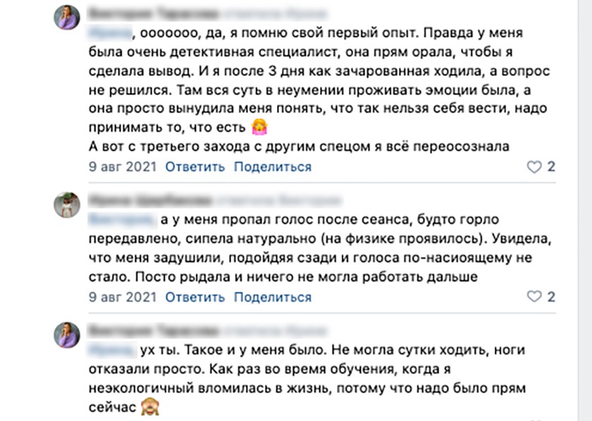 У Ольги С. (фамилия изменена) гипотиреоз, она рассказала «Правмиру», что обратилась к тому же психологу — полечить щитовидную железу. «Уникального терапевта» посоветовала знакомая: она ходила к нему на встречу в своем городе и была очень довольна.