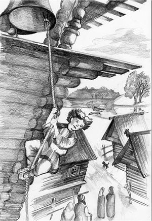 Как-то раз вечерня уже закончилась, прихожане разошлись, ушел из храма и отец Василий. А мальчик задержался на колокольне: нравилось ему забираться сюда по крутым лесенкам, чинно звонить в колокол. А еще нравилось обойти вокруг большой колокол и неспешно обозреть сверху родные просторы! Как красиво и широко раскинулось селение, какой необычный изгиб у реки! А вот и крыша родного дома!