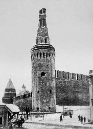 Испорчены Кремлевские башни, из которых угловая, Беклемишевская, сбита и стоит без вершины.