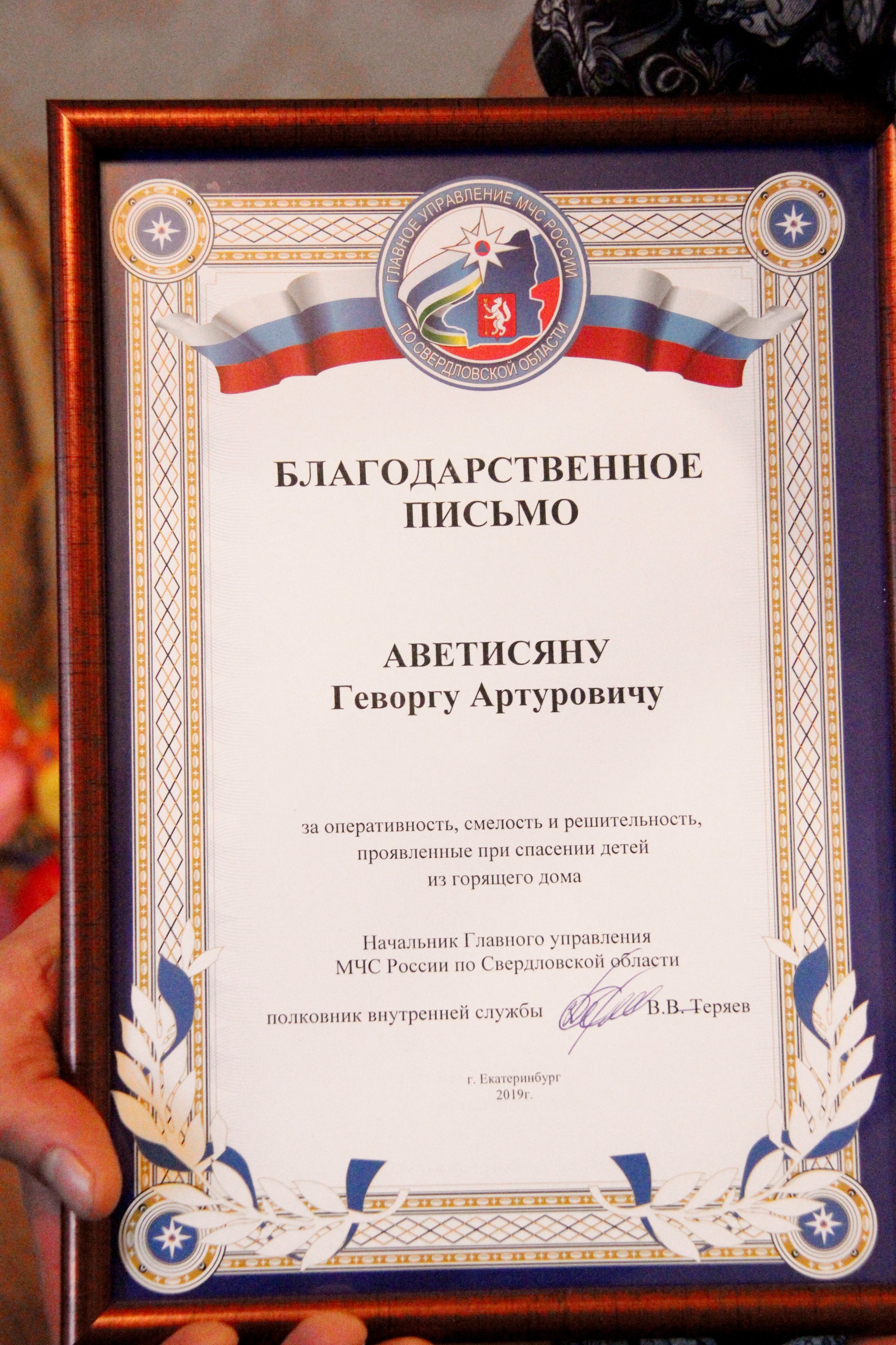 Но его чествовали, как настоящего героя. Благодарственное письмо начальника ГУ МЧС России по Свердловской области и огнетушитель в подарок ему вручил заместитель начальника областного ведомства по государственной противопожарной службе полковник внутренней службы Валерий Казаков.
