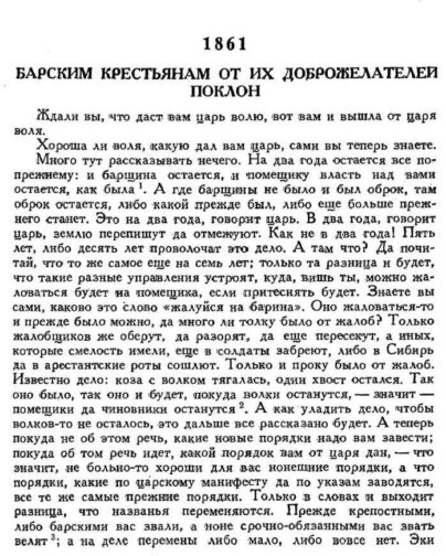 Другой пример — в 10-м классе мы изучаем далекую от современности прокламацию, которая называется «Барским крестьянам от их доброжелателей поклон» (прокламация, созданная под непосредственным впечатлением от Манифеста 19 февраля 1861 года об отмене крепостного права. — Примеч. ред.). Смотрим, где в ней реальное описание события, где гипербола, где демагогия, к чему этот призыв приведет. Это и называется умением отличать факт от интерпретации. Реальность от ее оценки.
