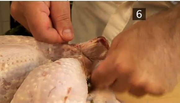 Поместите нож глубоко в полость шеи и отрежьте шею, оставив как можно больше кожи. Найдите локтевой сустав одного из крыльев, вставьте нож, разрежьте и удалите. Повторите с другим крылом.