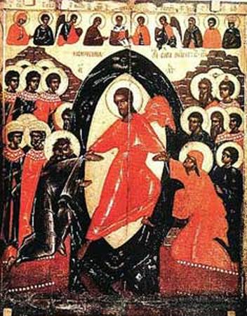 И князь преисподних, видя, что дважды повторился этот голос, сказал, как бы не понимая: Кто этот Царь Славы? Давид, отвечая князю преисподней, сказал: я знаю слова этого восклицания, ибо они те же, которыми пророчествовал я под наитием Его Духа… И теперь, гнусный и страшный князь преисподней, открой врата твои, да войдет в них Царь Славы. Когда Давид говорил слова эти князю преисподней, Господь Величия снизошел в виде человека и осветил мрак вечный, и разрушил узы неразрывные, и помощь непобедимой силы посетила нас, сидящих в глубине мрака греховного и в тени смерти грешников».