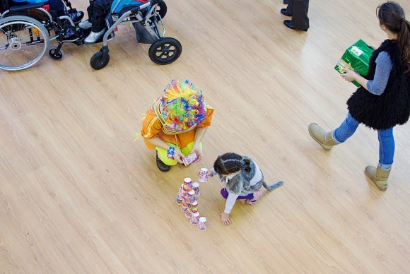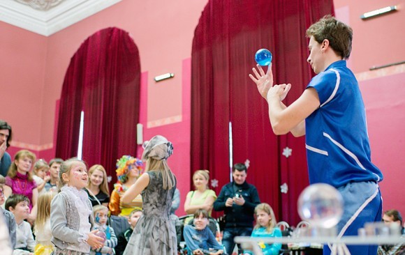 А когда вместо ожидаемого Деда Мороза на сцену поднимается Сергей Галанин, родители, понятно, приходят в гораздо больший восторг, чем дети. За этим следует хоровод с колясками; на жонглёров после все уже смотрят вместе.