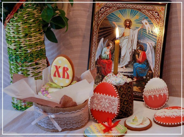Поскольку мы печем пряники, то в этом году решили украсить кулич сахарными цветами и топпером в виде крашенки с буквами ХВ.