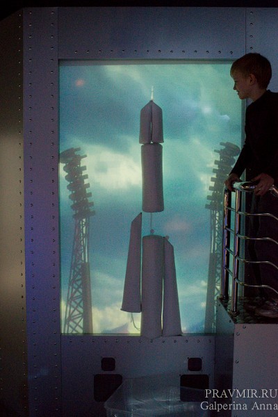 У интерактивной модели старта ракеты «Союз» толпятся дети. Суть модели такова: вы нажимаете кнопку на пульте, и металлический голос приказывает вам готовиться к полету. Нужно взять части ракеты, изготовленные из мягкого материала, и прикрепить на вертикальный интерактивный экран.